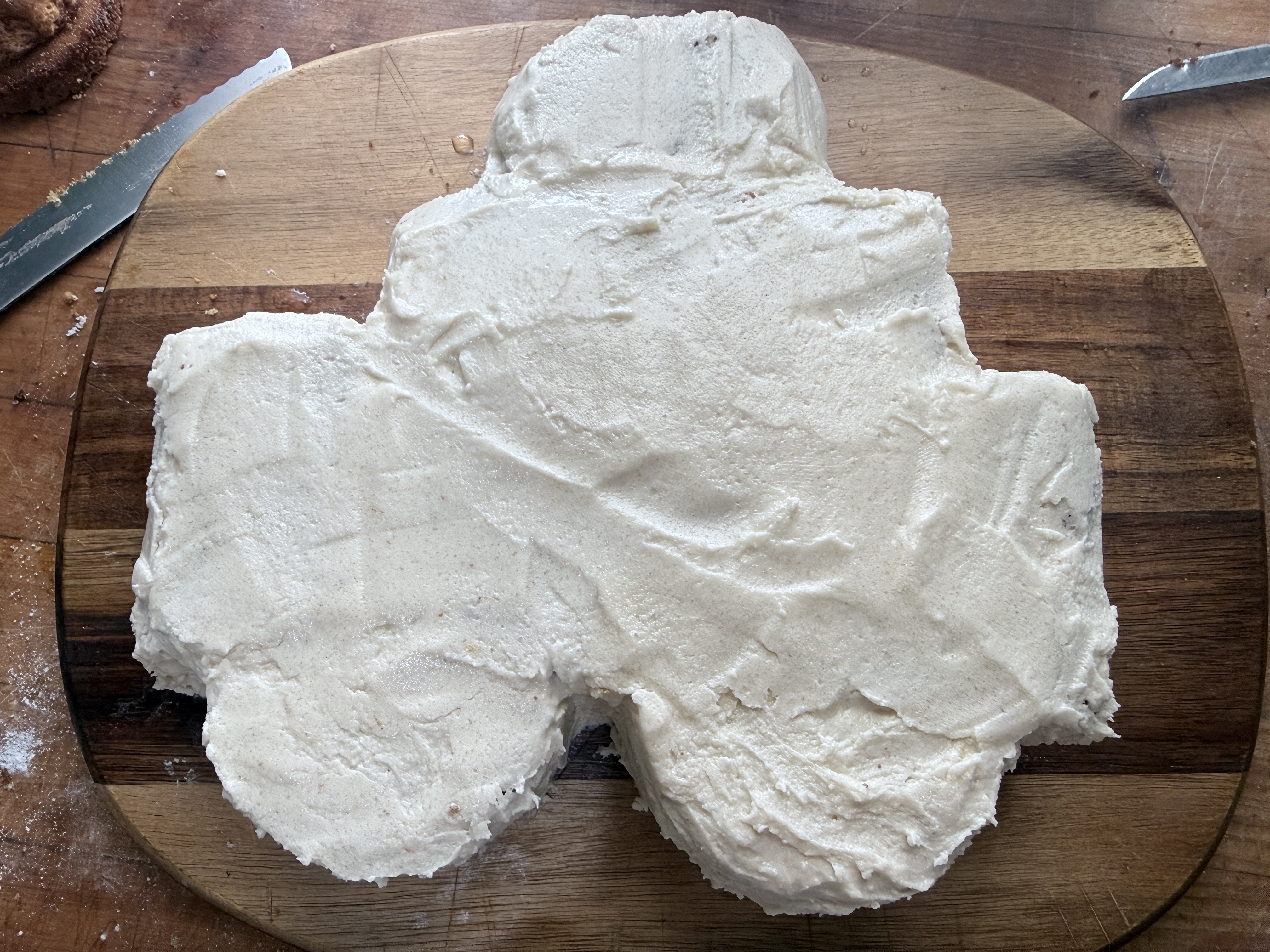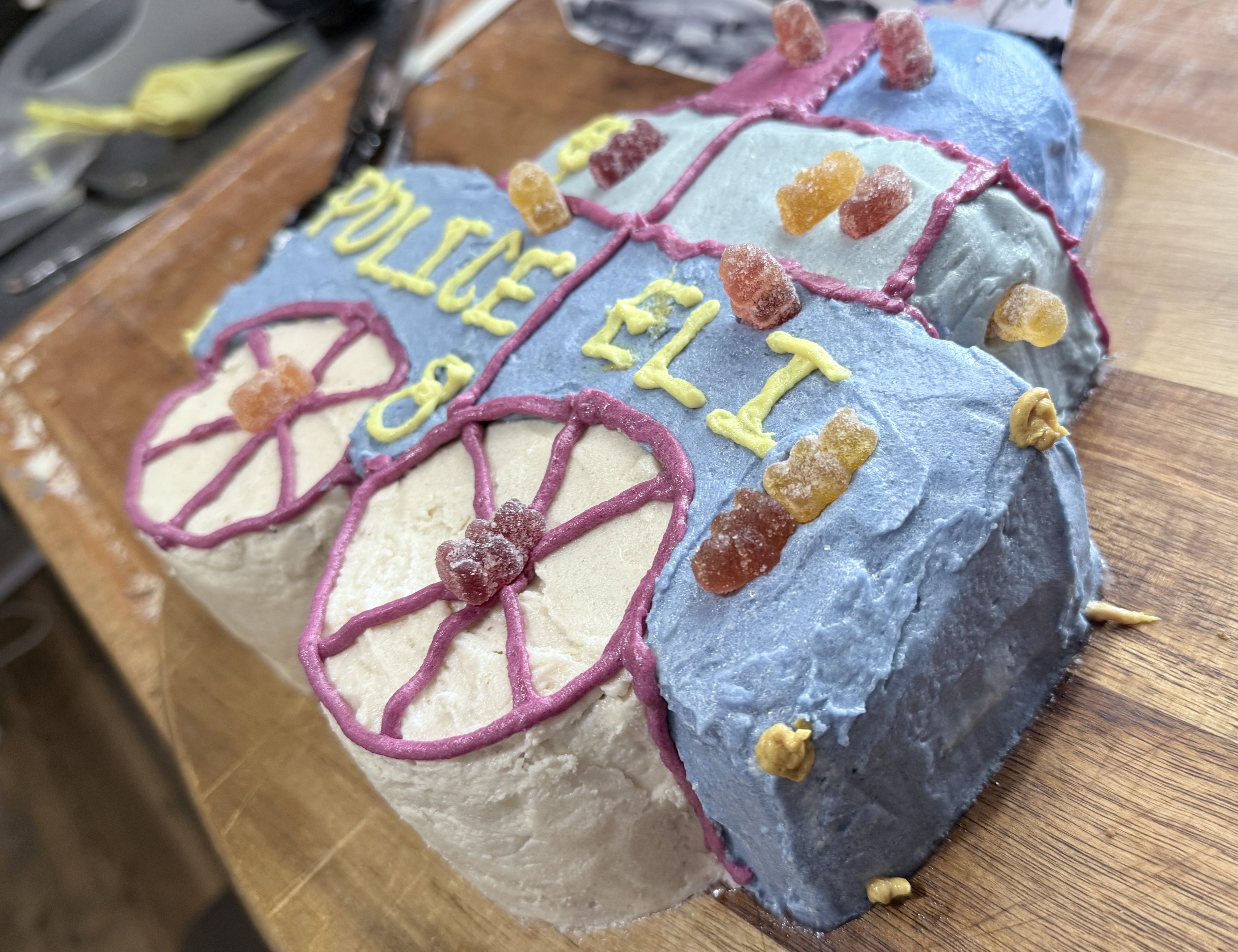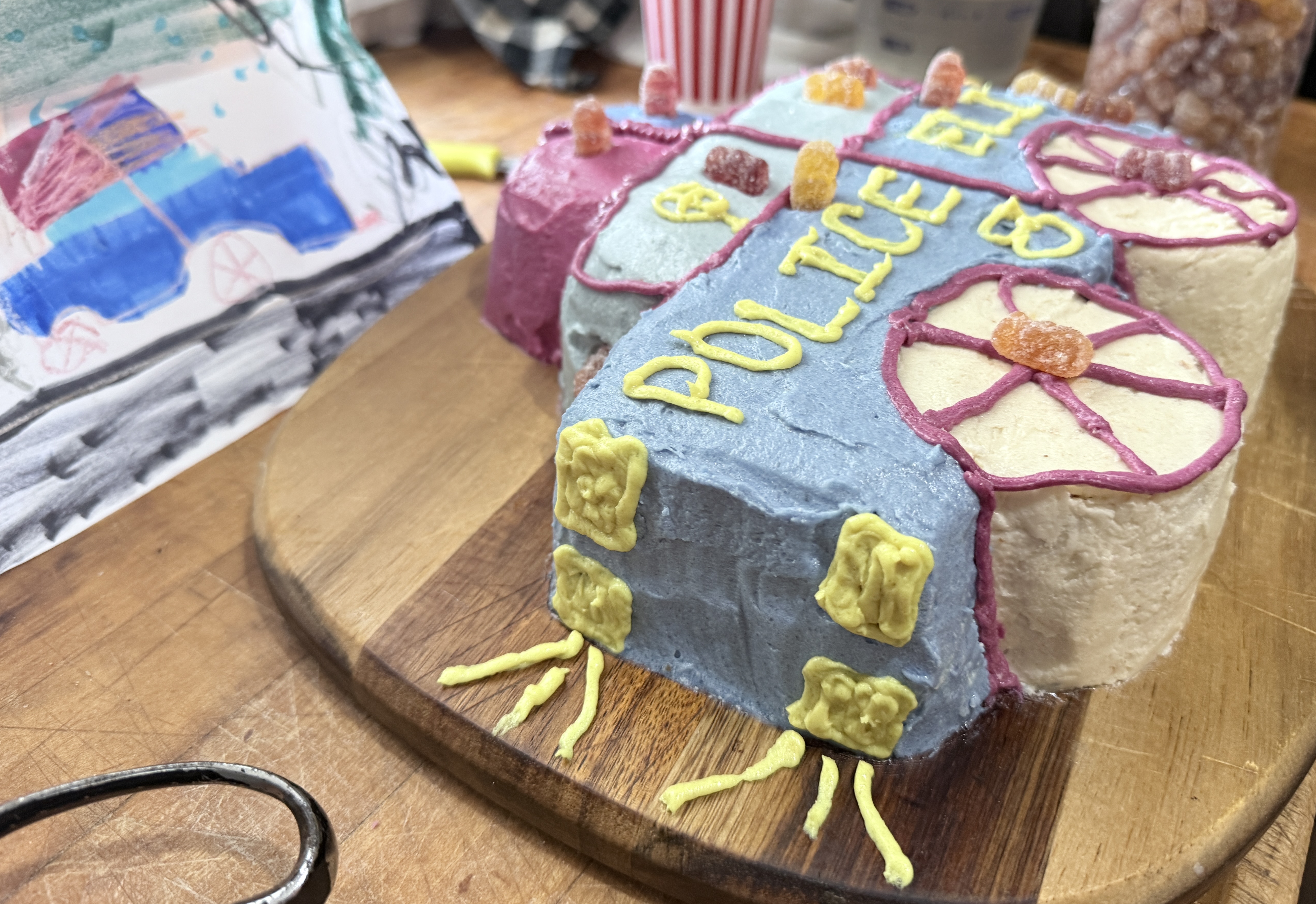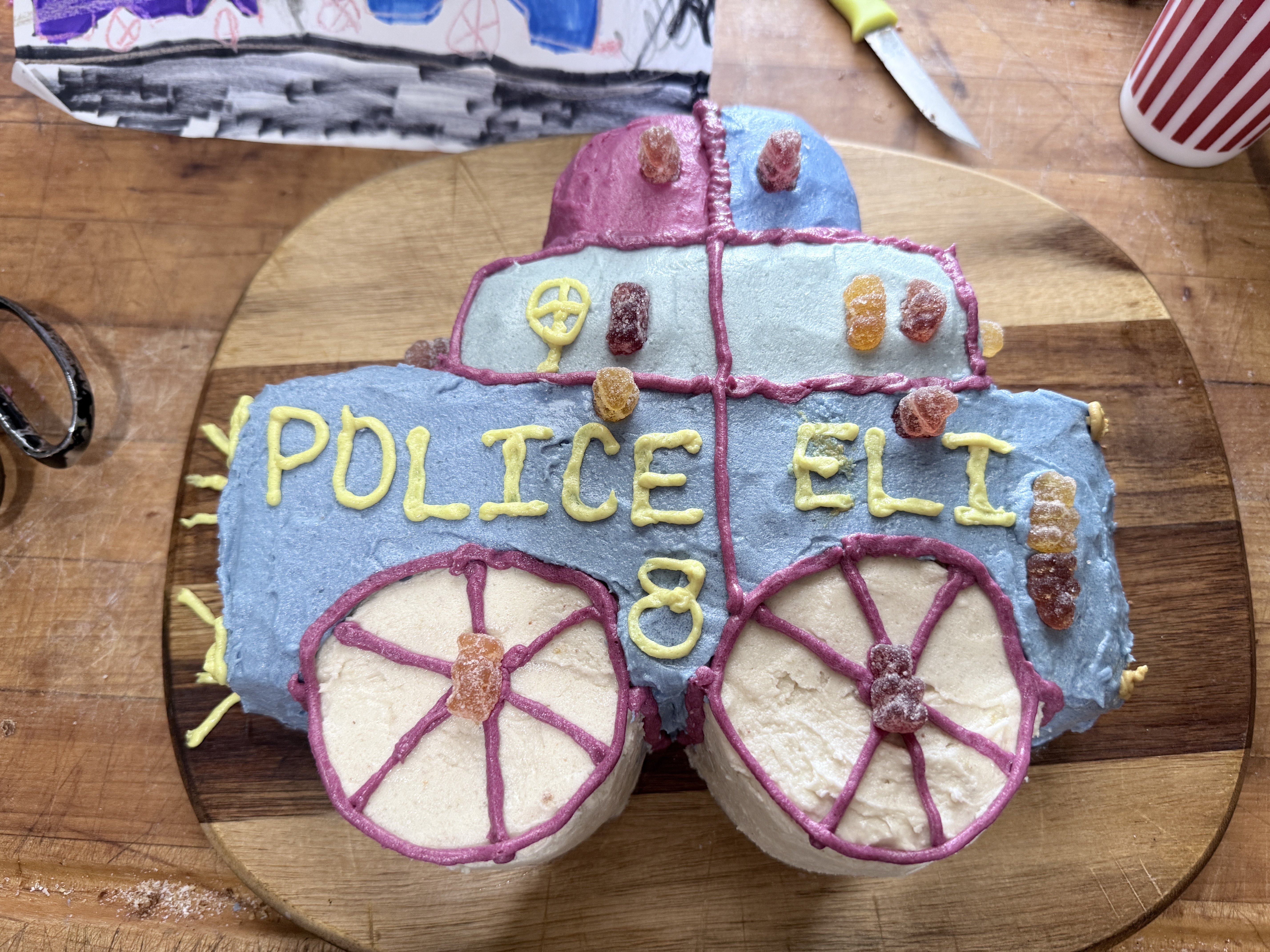 He loved my idea, and showed me a picture of his police car. Bingo! So we started brainstorming how to cut a square cake to make it longer and have extra cake for the lights on top. We sliced the cake with our bread knife, and stuck them together with buttercream frosting during the crumb coat.