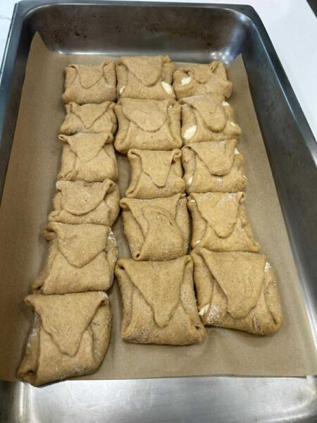 - After the rise, dump the dough on the floured counter, knead gently for a couple minutes then roll out in a rectangle about 12”x 16”. Cut in about 16-18 squares, does not have to be exact. Put a teaspoon full of the cheese filling in the middle of each square. Bring opposite corners in the center adding a little water with your finger to help stick together, to look like an envelope. Put each one of them on a parchment lined tray, not touching each other. Cover and let rise 30 minutes. Preheat the oven at 375degrees F.
