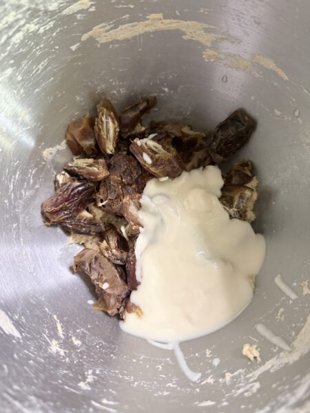 - Place sourdough starter, dates, and softened coconut butter to your stand mixer and use the paddle to cream the mixture, starting on low speed so the dates don't fly out.