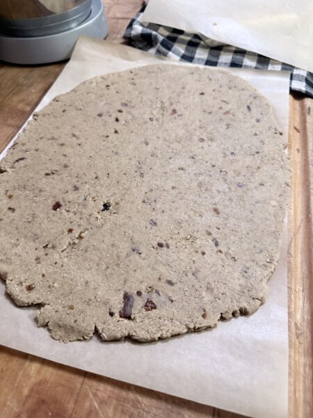- Roll out the cookie dough between two sheets of parchment, or lightly flour the dough so the rolling pin does not stick. Your choice.